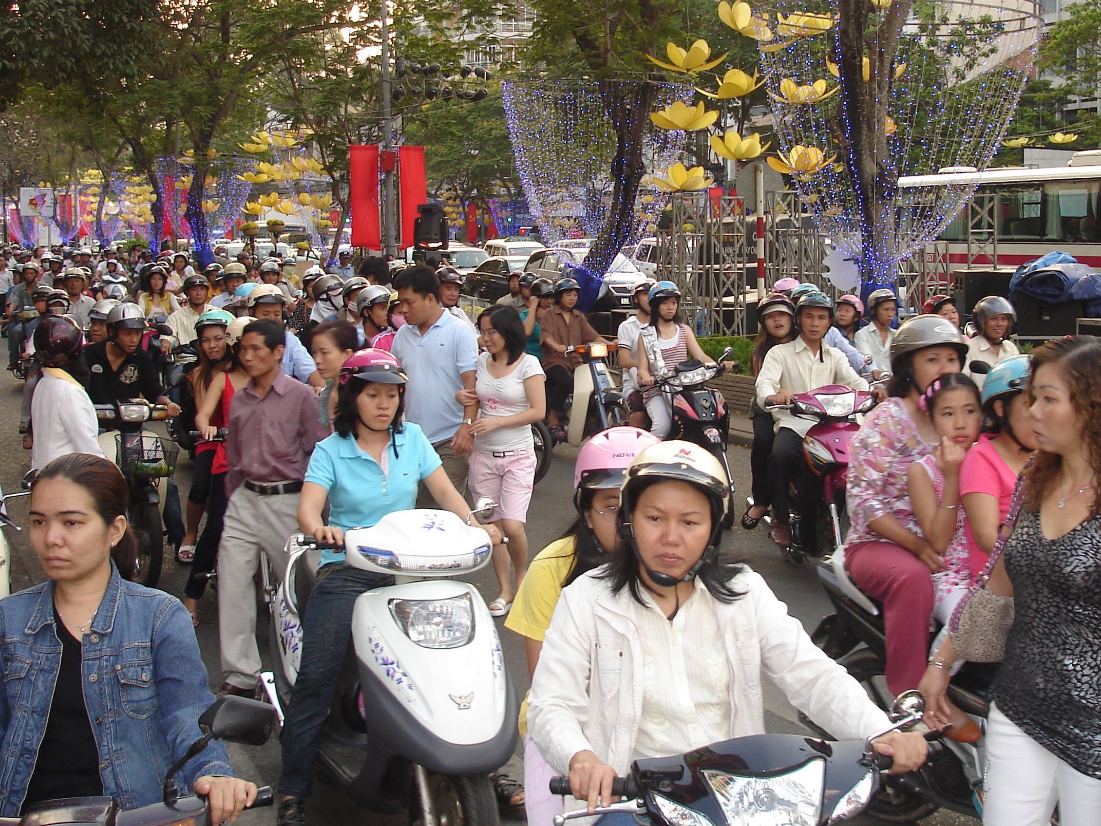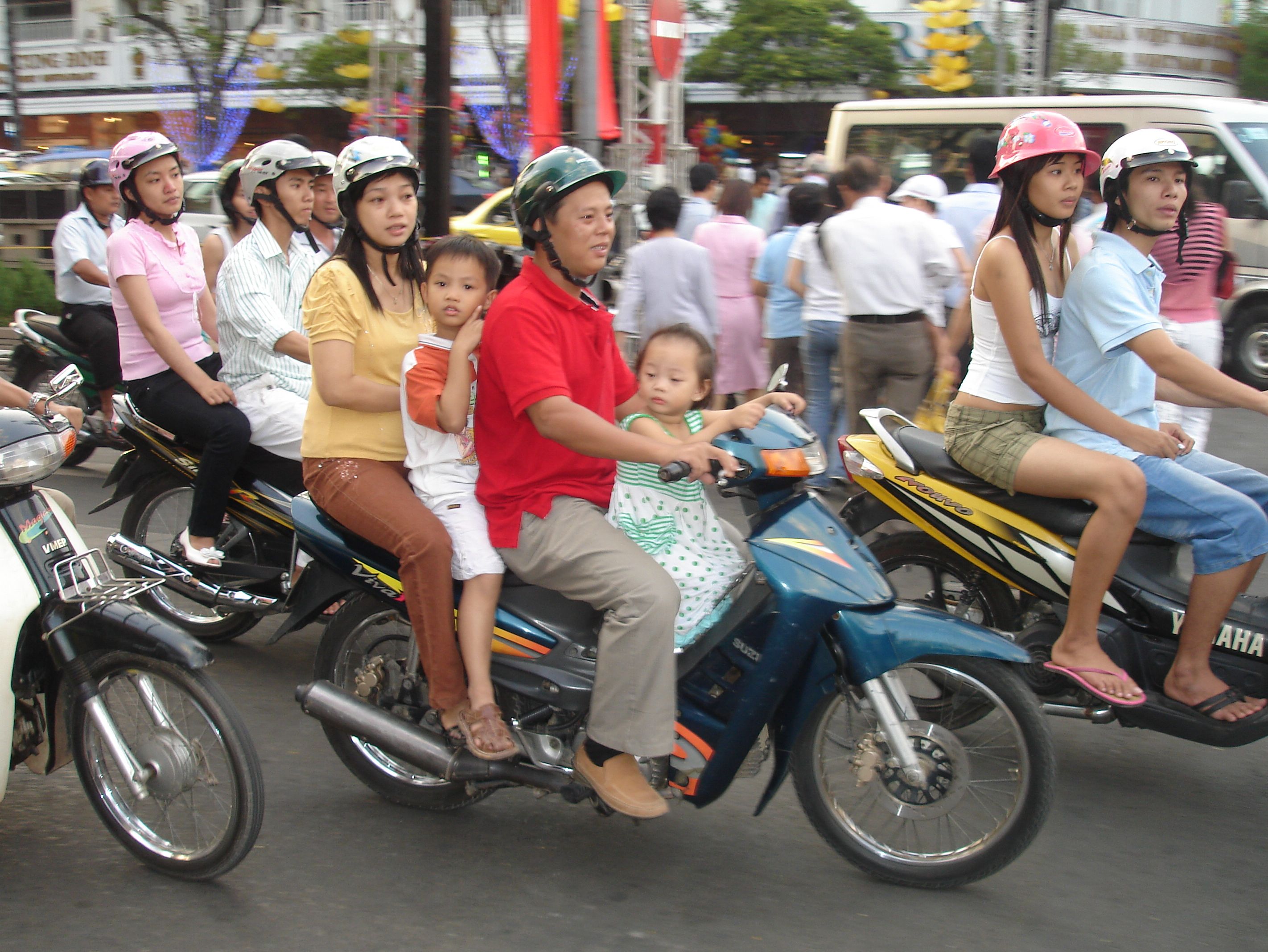We were exhausted when we got in, so after a brief nap, we set out to see the events! We didn’t know what the events were or where they would be (more clueless than in Brazil for Carnaval last year) so we just thought we’d follow the sound of firecrackers. There were no firecracker sounds to follow so we just walked towards downtown (not far). The first thing you notice in Vietnam is the incredible number of motor scooters. Seems that every family must have (at least) one. Often, you will see the whole family on one.